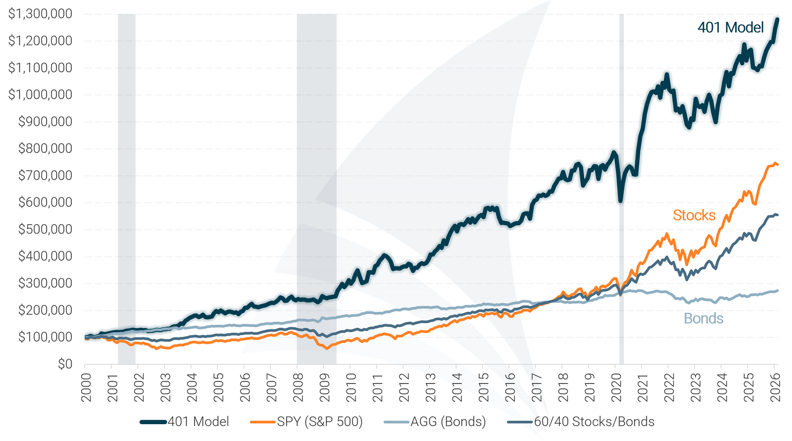 The 401 Model actively adjusts between stock and bond funds based on market conditions. It shifts into high-growth investments during strong markets and moves to safer assets when risks increase, helping your portfolio stay ahead of market changes.